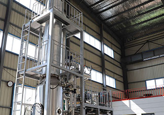 降膜蒸发是将料液自降膜蒸发器加热室上管箱加入,经液体分布及成膜装置,均匀分配到各换热管内,在重力和真空诱导及气流作用下,成均匀膜状自上而下流动。流动过程中,被壳程加热介质加热汽化,产生的蒸汽与液相共同进入蒸发器的分离室,汽液经充分分离,蒸汽进入冷凝器冷凝(单效操作)或进入下一效蒸发器作为加热介质,从而实现多效操作,液相则由分离室排出。
